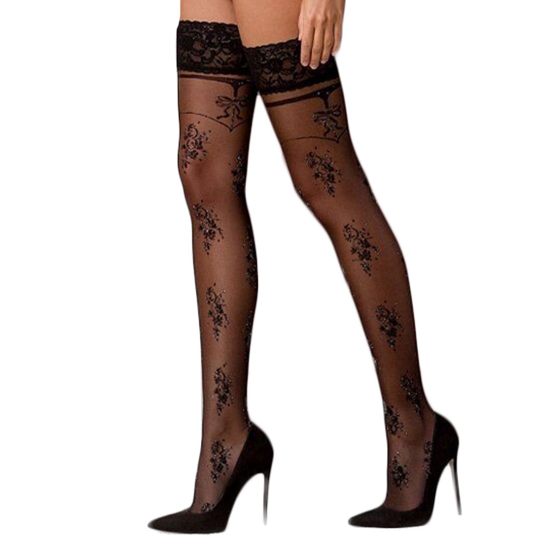 Черные чулки Passion ST119 5 добавят элегантности и чувственности вашей коллекции нижнего белья. Эти чулки украшены замысловатым цветочным узором, который обязательно привлечет внимание, а мерцающая нить из люрекса придаст нотку гламура.