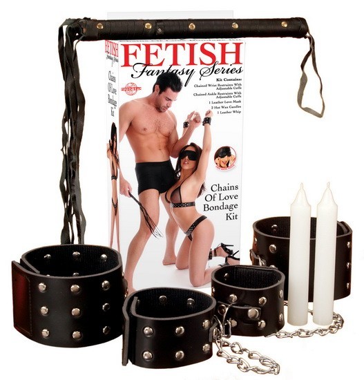 Набор CHAINS OF LOVE BONDAGE KIT состоит из фиксаторов на руки, фиксаторов для ног, плети, две свечи, и маски на глаза.